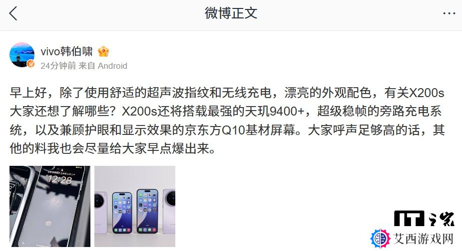 本站 3 月 26 日消息,vivo 通信科技有限公司产品经理韩伯啸今日发文公布了 vivo X200s 手机部分配置信息:新机将搭载最强的天玑 9400+ 处理器、拥有旁路充电系统、配备京东方 Q10 基材屏幕。