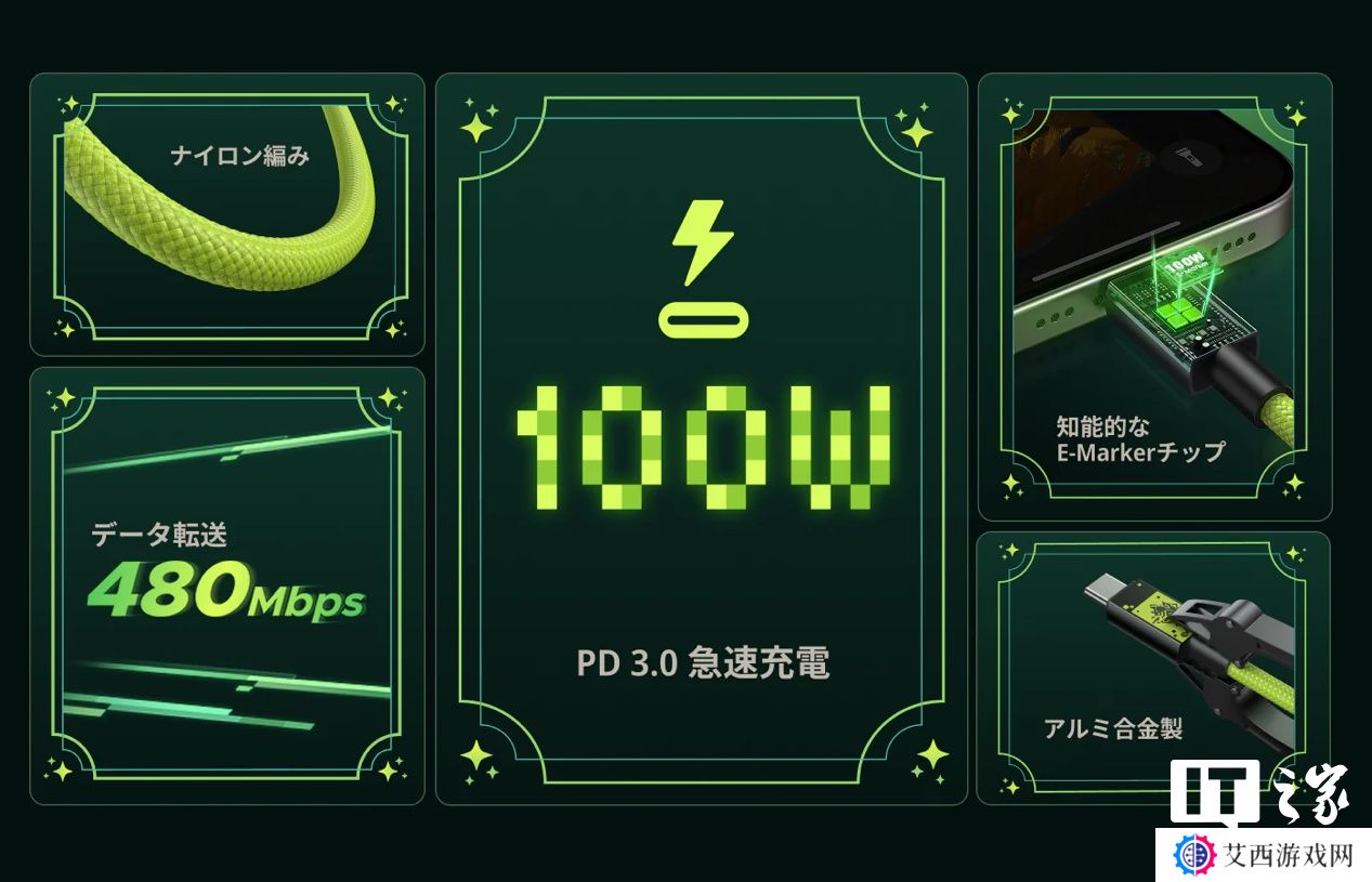 支持 PD 3.0 标准,尼龙编织线设计,最大支持 100W 输出,E-Marker 芯片兼容多种设备,支持 USB 2.0 速度。