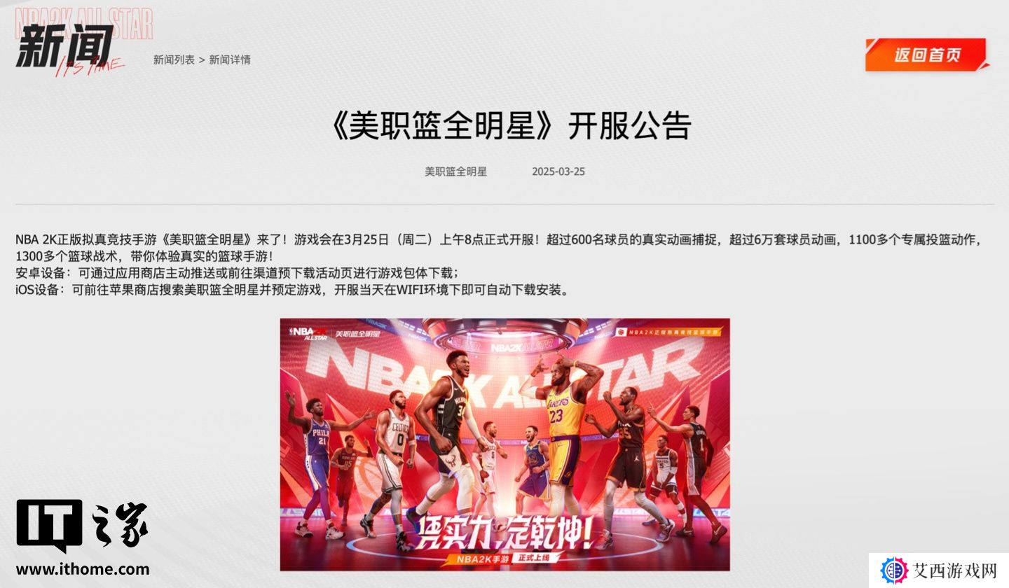 本站3 月 25 日消息,据“2K Games 中国”微博,NBA2K All Star (美职篮全明星) 手游定档现已上线,本作是由 NBA 官方授权,腾讯与 2K 团队联手打造的全新 NBA2K 系列篮球竞技手游。